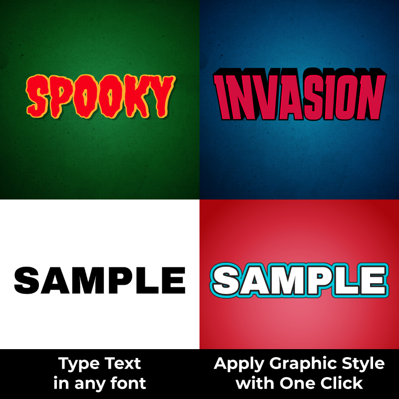 Illustrator Graphic Styles based on classic comic book titles. Ten editable vector text effects for Adobe Illustrator, the words and font can be easily changed and scaled without loss of detail. Instructions on how to use graphic style have been provided in the Instructions.pdf.