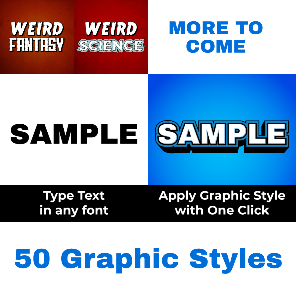 Illustrator Graphic Styles based on classic comic book titles. All 50 editable vector text effects from volumes 1-5 for Adobe Illustrator, the words and font can be easily changed and scaled without loss of detail. Instructions on how to use graphic style have been provided in the Instructions.pdf. Will be updated when new Comic Book Title Packs come out.