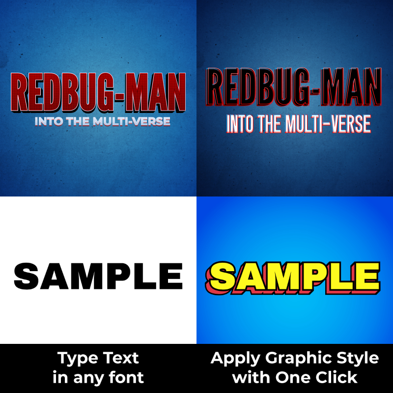 Illustrator Graphic Styles based on classic comic book titles. Ten editable vector text effects for Adobe Illustrator, the words and font can be easily changed and scaled without loss of detail. Instructions on how to use graphic style have been provided in the Instructions.pdf.